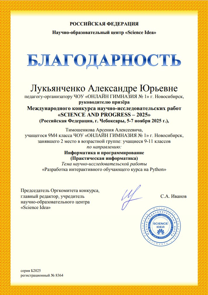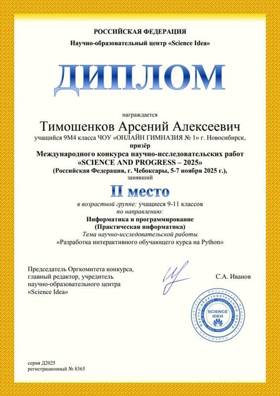 Арсений Тимошенков, ученик 9 класса ЧОУ “Онлайн Гимназия №1” отметил выдающиеся результаты на международном конкурсе “SCIENCE and Progress – 2025”, заняв призовое II место среди 9-11 классов по программированию.