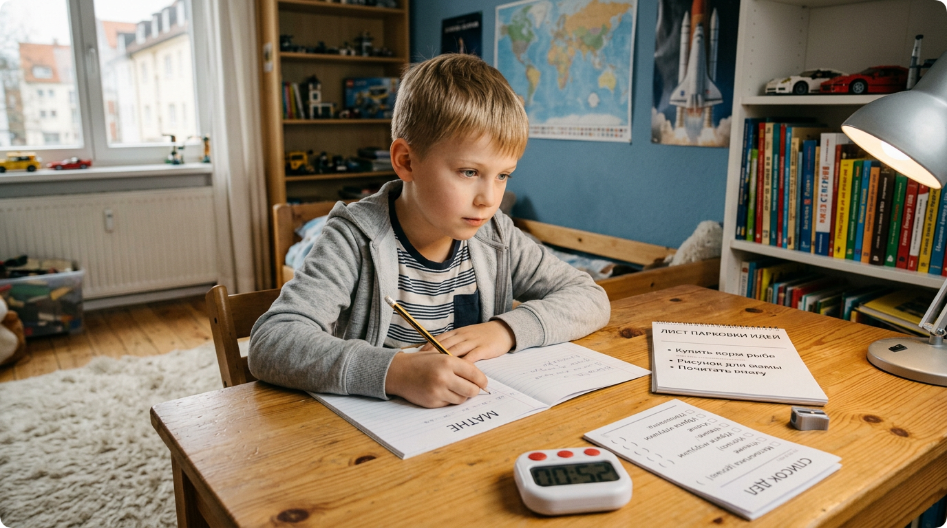 Пространство. Отдельная тихая зона для занятий — без отвлекающих факторов (уведомления на телефоне выключены, музыка без слов или тишина, игрушки убраны). Освещение слева (для правшей), минимализм на столе. Визуальный таймер и чек-листы шагов задания — на виду.