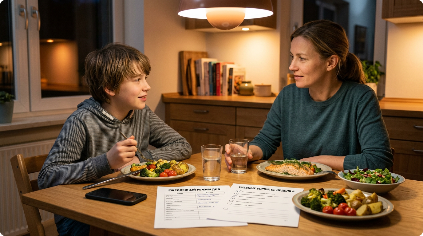 Сон. 9–11 часов для младших школьников (7–10 лет), 8–9 для подростков (11–14 лет). Без гаджетов за 60–90 минут до сна (синий свет экранов нарушает выработку мелатонина). Ритуалы засыпания: книга, тёплый душ, одно и то же время отбоя даже в выходные.