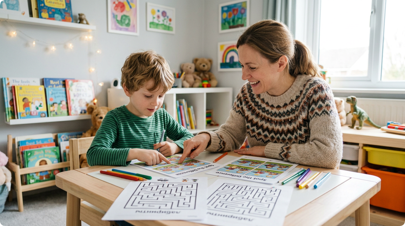 Лайфхак: есть куча приложений и распечаток в интернете. Начинайте с простых картинок (5 отличий), постепенно усложняйте.