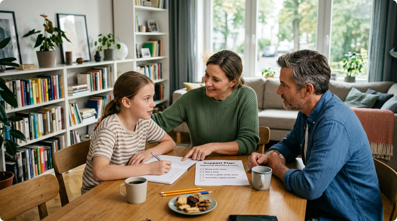 Шаблон разговора с учителем: «Здравствуйте! Дома замечаю, что [имя ребёнка] часто отвлекается. Как на уроках? Можем договориться о посадке ближе к доске, визуальных подсказках на парте, инструкциях?».