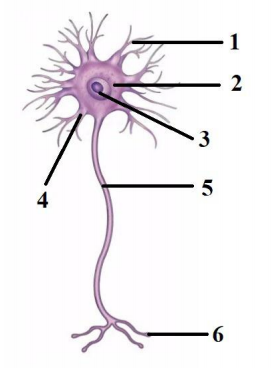 Выберите три верно обозначенные подписи к рисунку, на котором изображено строение нейрона. Запишите в таблицу цифры, под которыми они указаны.