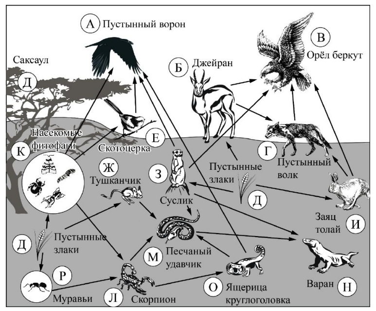 Проанализируйте биотические отношения между организмами экосистемы пустыни. Как изменится численность беркутов и скорпионов, если в течение нескольких лет шло уменьшение численности тушканчиков?