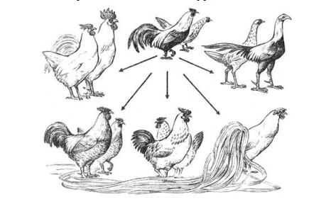 Рассмотрите рисунок, на котором изображены породы кур, выведенные человеком от общего предка – банкивских кур. Какое ОБЩЕЕ свойство живых систем иллюстрирует данный рисунок?