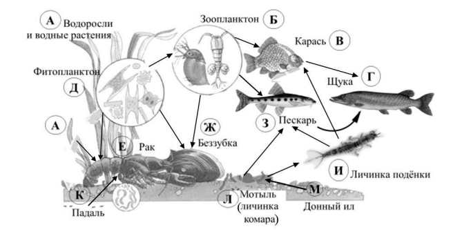 Составьте пищевую цепь из четырёх организмов, в которую входит щука. В ответе запишите соответствующую последовательность букв, которыми обозначены организмы на схеме.