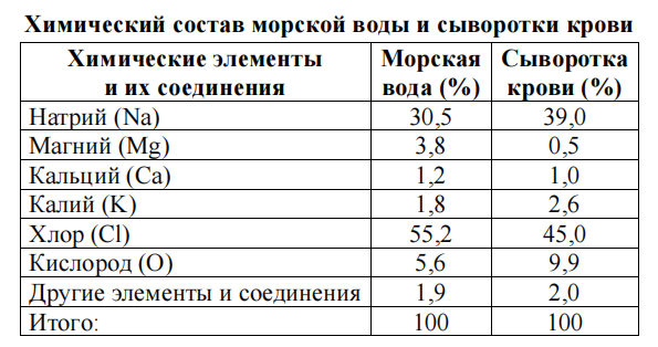 Пользуясь таблицей 1 «Химический состав морской воды и сыворотки крови» и знаниями из школьного курса биологии, ответьте на следующие вопросы.