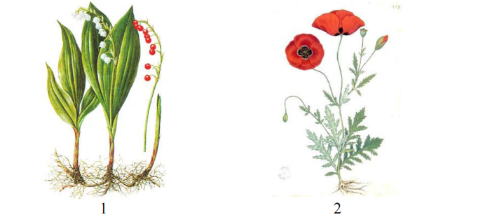 Установите соответствие между характеристиками и растениями, изображёнными на рисунках 1 и 2: к каждому элементу первого столбца подберите соответствующий элемент из второго столбца.
