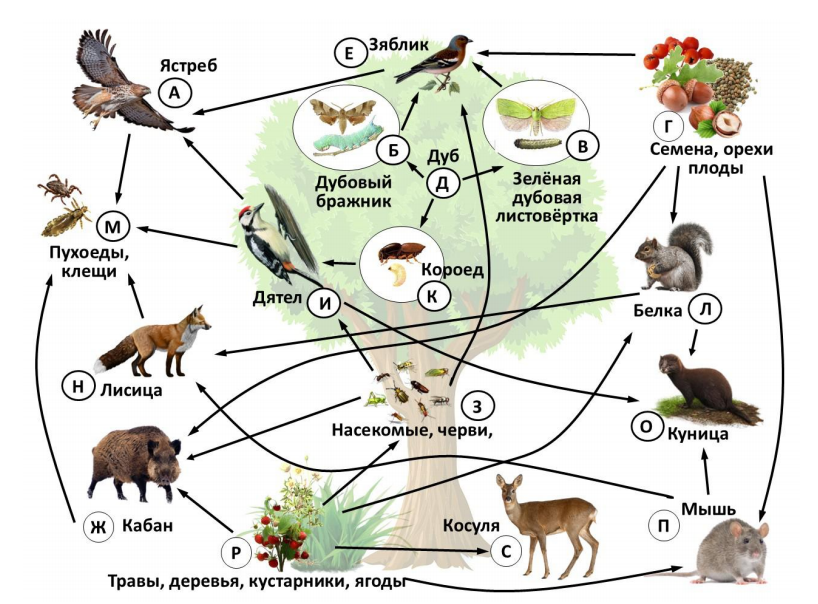 Составьте пищевую цепь из четырёх организмов, в которую входит куница. В ответе запишите соответствующую последовательность букв, которыми обозначены организмы на схеме.