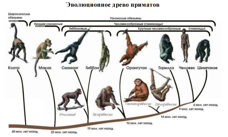 Пользуясь схемой «Эволюционное древо приматов» и знаниями из школьного курса биологии, ответьте на вопросы и выполните задание.