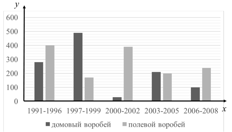 Изучите столбчатую диаграмму, отражающую динамику плотности популяций двух видов воробьёв в окрестностях заповедника «Брянский лес». Какие два из приведённых описаний характеризуют данную зависимость?