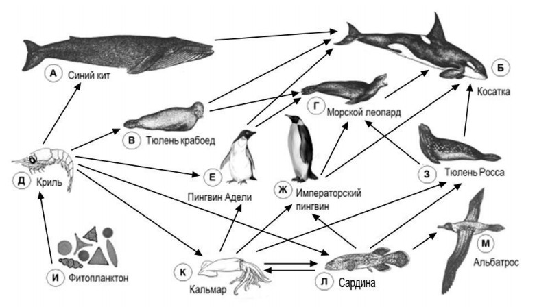 Составьте пищевую цепь из четырёх организмов, в которую входит императорский пингвин. В ответе запишите соответствующую последовательность букв, которыми обозначены организмы на схеме. Цепь начните с продуцента.