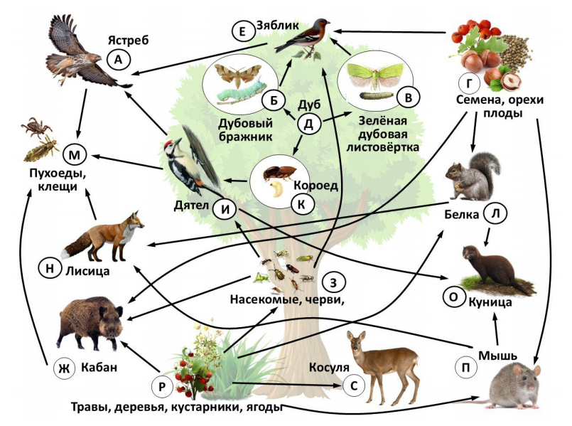 Составьте пищевую цепь из четырёх организмов, в которую входит куница. В ответе запишите соответствующую последовательность букв, которыми обозначены организмы на схеме. Цепь начните с продуцента.
