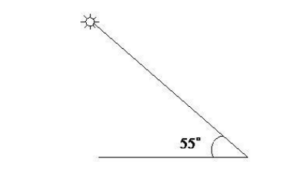 Высота Солнца над горизонтом (см. рисунок) равна 55°. Луч падает на плоское зеркало, лежащее на горизонтальной поверхности. Чему равен угол отражения луча от зеркала?