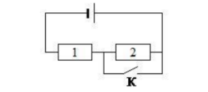 На рисунке изображена электрическая цепь, состоящая из источника тока, резисторов 1 и 2 и ключа К. Как изменяются сила тока в цепи и общее сопротивление цепи при замыкании ключа К?