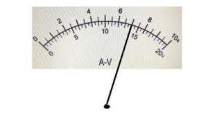 Прибор на рисунке подключён в режиме вольтметра. Запишите результат измерения напряжения, с учётом абсолютной погрешности измерения, которая равна цене деления шкалы прибора.