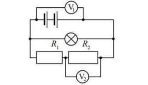 В электрической цепи (см. рисунок) вольтметр V1 показывает напряжение 2 В, вольтметр V2 – напряжение 0,5 В. Чему равно напряжение на лампе?