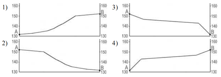 На рисунках представлены варианты профиля рельефа местности, построенные на основе карты по линии А – В разными учащимися. Какой из профилей построен верно?