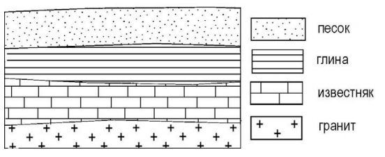 Во время экскурсии учащиеся сделали схематическую зарисовку залегания горных пород на обрыве в карьере. Расположите показанные на рисунке слои горных пород в порядке увеличения их возраста (от самого молодого до самого древнего). Запишите в таблицу получившуюся последовательность цифр.