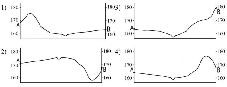 На рисунках представлены варианты профиля рельефа местности, построенные на основе карты по линии А – В разными учащимися. Какой из профилей построен верно?