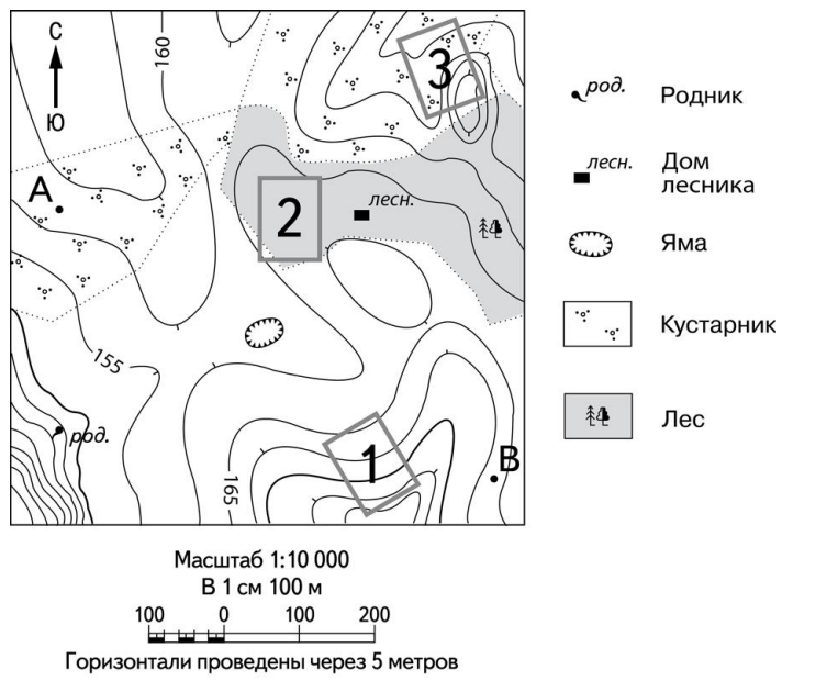 Школьники выбирают место для катания на санках. Определите, какой из участков, обозначенных на карте цифрами 1, 2 и 3, больше всего подходит для этого. Для обоснования Вашего ответа приведите два довода.