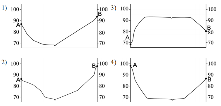 На рисунках представлены варианты профиля рельефа местности, построенные на основе карты по линии А – В разными учащимися. Какой из профилей построен верно?