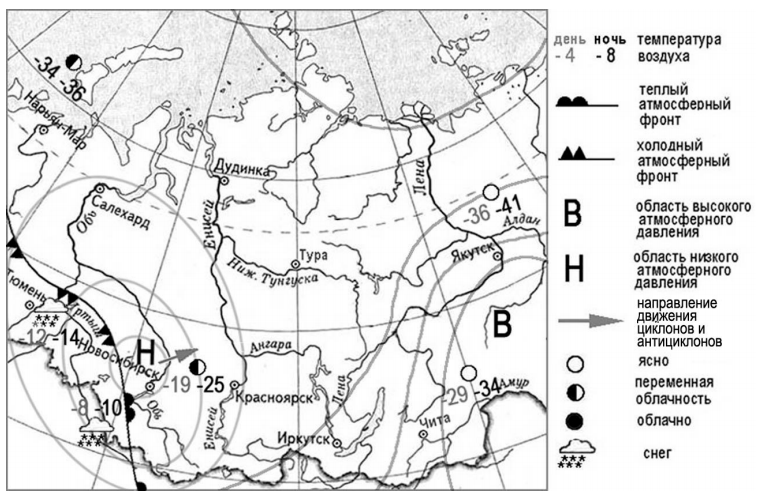 Задания 5 и 6 выполняются с использованием приведённой ниже карты погоды.