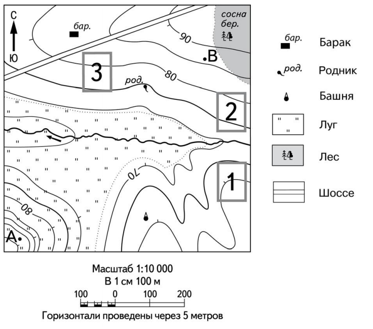 Российский фермер выбирает участок для закладки нового фруктового сада. Ему нужен участок, на котором весной рано сходит снег, а летом почва лучше всего прогревается солнцем. Он также должен иметь расположение, удобное для вывоза собранного урожая на консервный завод. Определите, какой из участков, обозначенных на карте цифрами 1, 2 и 3, больше всего отвечает указанным требованиям. Для обоснования Вашего ответа приведите два довода.
