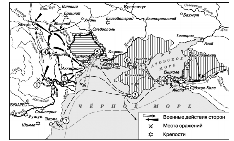 «В сентябре вражеские корабли начали бомбардировку Кинбурской крепости. Захват Кинбурна предотвращал подготовку и нападение русских на расположенную неподалеку крепость _____. Бой при Кинбурне стал первой крупной победой российских войск в войне. Это позволило русским войскам с суши осадить ______. В июле произошло сражение между вражескими судами и кораблями Севастопольской эскадры. В результате вражеский флот не только не помог своим сухопутным войскам в крепости, но и лишился господства на Чёрном море».