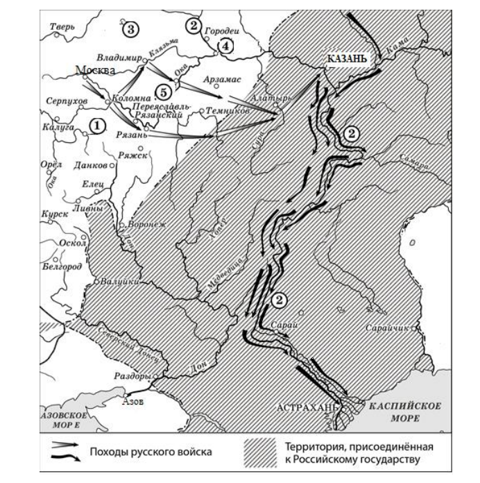 Прочитайте отрывок из сочинения историка и укажите цифру, обозначающую на схеме город, название которого пропущено в данном отрывке.«16 июня после большого смотра царские войска выступили из Москвы к Коломне. Для дальнейшего продвижения войска разделились. Сам царь во главе крупного войска выступил из Коломны к Владимиру, откуда пошёл на _______, Арзамас с дальнейшим выходом на Суру, где должен был соединиться с отрядом, двигавшимся через рязанские земли, которым руководил И.Ф. Мстиславский».