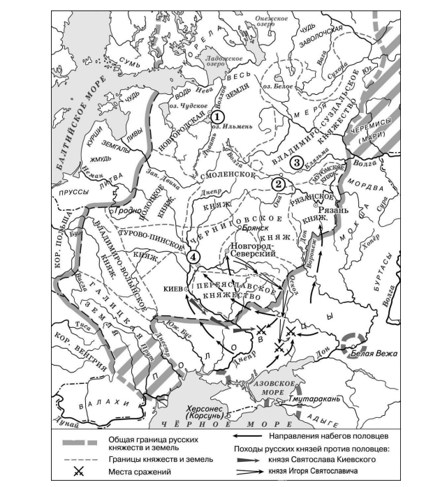 «Появившись в восточноевропейских степях, половцы неоднократно нарушали границы Руси и опустошали её земли, доходили из низовьев Днепра до Киева. Будучи на стадии кочевания, они проявляли особую агрессивность. По летописным источникам насчитывается 46 походов половцев на Русь, не считая мелких набегов. В ходе одного из первых столкновений русских и половцев во главе с ханом Искалом была разбита рать Всеволода Ярославича, разорено Переяславское княжество. Половцы опустошали Русскую землю, дошли до Новгород-Северского и до __________. Святослав Черниговский собрал войско, ударил и одолел половцев…»