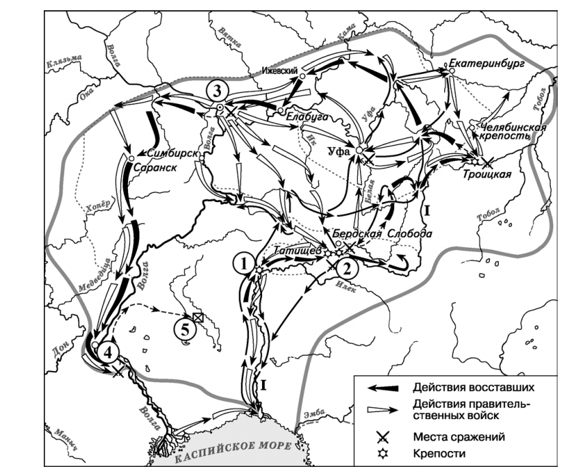 «Восстание распространилось на весь Южный Урал. Большинство городов сопротивления мятежникам не оказывало, – восставшие без боя заходили в города, где жители пополняли их ряды. Восставшие подошли к губернскому городу _______ и осадили его. В район восстания был отправлен карательный отряд, численностью в полторы тысячи человек, чтобы подавить мятеж. Генерального сражения не случилось, правительственные войска были разбиты. Осаждённым городом овладела паника, – его осада длилась уже шесть месяцев. Вновь было отправлено войско против восставших. Сражение произошло вблизи Татищевой крепости, победу одержали правительственные войска. Город _____ восставшим взять не удалось, и, преследуемые правительственными войсками, они двинулись на восток».