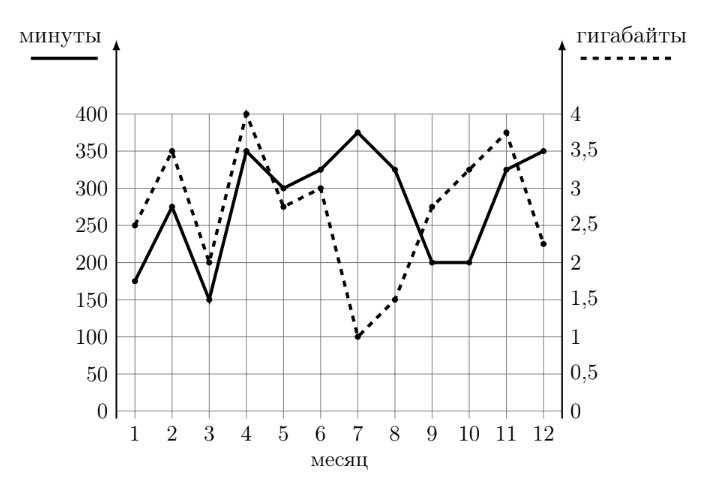 На рисунке точками показано количество минут исходящих вызовов и трафик мобильного интернета в гигабайтах, израсходованных абонентом в процессе пользования смартфоном, за каждый месяц 2019 года. Для удобства точки, соответствующие минутам и гигабайтам, соединены сплошными и пунктирными линиями соответственно.
