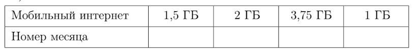 ЗАДАНИЕ 1. Определите, какие месяцы соответствуют указанному в таблице трафику мобильного интернета. Заполните таблицу, в бланк ответов перенесите числа, соответствующие номерам месяцев, без пробелов, запятых и других дополнительных символов (например, для месяцев май, январь, ноябрь, август в ответе нужно записать число 51118).