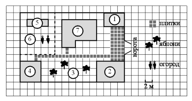 Все дорожки внутри участка имеют ширину 1 м и вымощены тротуарной плиткой размером 1 м × 1 м. Между гаражом и сараем находится площадка, вымощенная такой же плиткой.