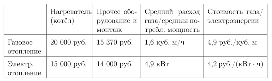 ЗАДАНИЕ 5. Хозяин участка планирует установить в жилом доме систему отопления. Он рассматривает два варианта: электрическое или газовое отопление. Цены на оборудование и стоимость его установки, данные о расходе газа, электроэнергии и их стоимости даны в таблице.
